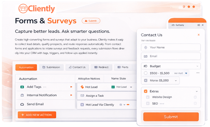 Create high-converting forms and surveys that adapt to your business. Cliently makes it easy to collect lead details, qualify prospects, and route responses automatically. From contact forms and applications to intake surveys and feedback requests, every submission flows directly into your CRM with tags, triggers, and follow-ups applied instantly.
