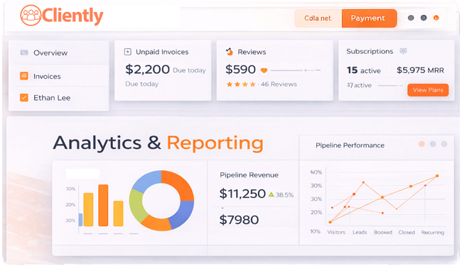 Send invoices, accept payments, and manage subscriptions without leaving Cliently. Automate billing for one-time services or recurring plans, track payment status, and trigger follow-ups for failed or overdue charges. Everything ties directly into your contacts, pipelines, and reporting.