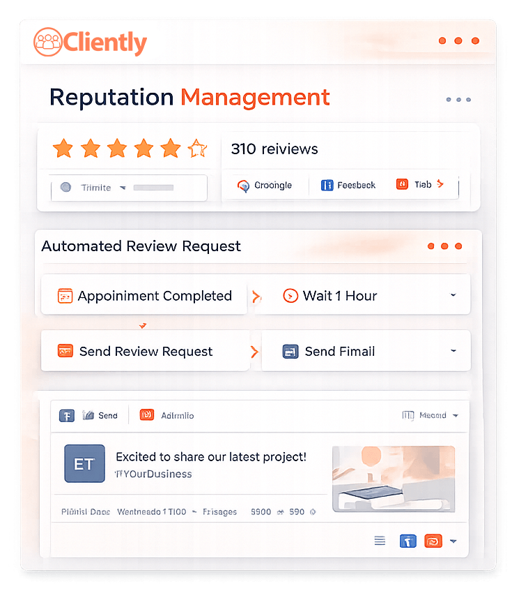 Automate review requests and manage your online reputation from one place. Cliently helps you collect more 5-star reviews, respond quickly, and monitor feedback across platforms. Trigger review requests after appointments, payments, or job completion and build social proof.