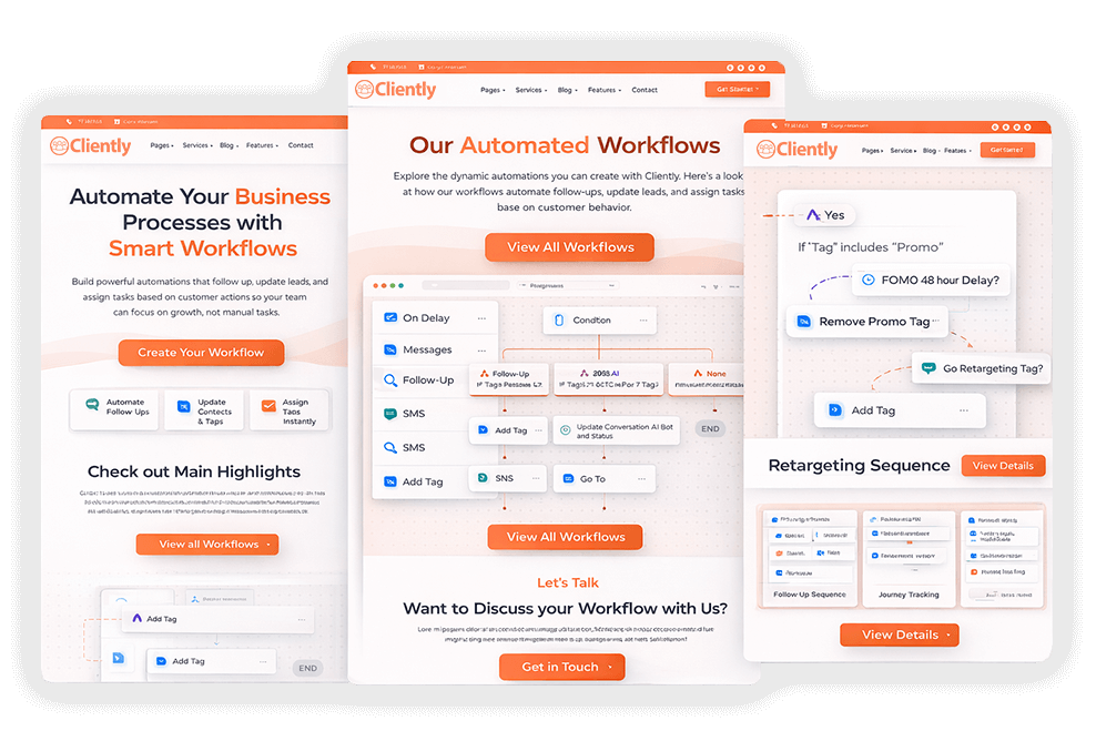 Cliently’s workflow automation lets you automatically trigger follow-ups, tasks, messages, tagging, and lead routing based on real customer behavior. Whether someone submits a form, books an appointment, replies to a message, or misses a call, Cliently responds instantly—keeping every lead engaged and every process moving without manual effort.